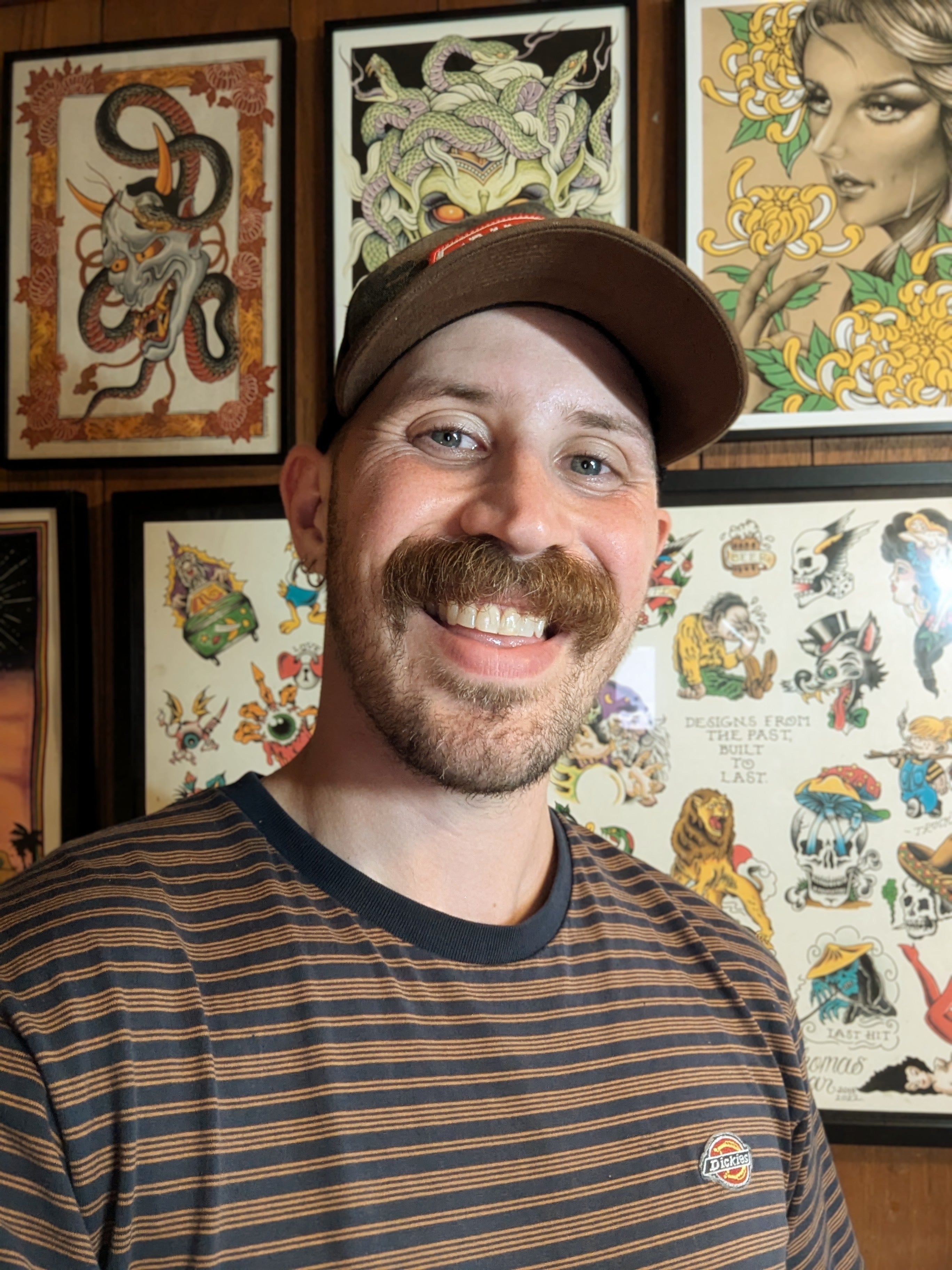 @lukeetho keeps it fun and solid — simple, clever tattoos with bold lines and rad, punchy colour. Off the skin, his loose paintings carry the same playful edge: fun shapes, rough brushwork, and ideas that feel light but stick with you. Classic and fresh at once.